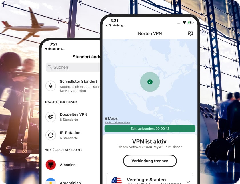 Die Vorteile eines VPNs für Ihr iPhone und iPad umfassen die Möglichkeit, Ihre IP-Adresse zu verschleiern, im Internet anonym zu bleiben, Online-Tracking zu verhindern, Ihre Internetdaten zu verschlüsseln und Ihren Standort zu wechseln, damit Sie auf Ihre Lieblingsinhalte zugreifen können. Einige Norton VPN-Abos enthalten außerdem einen Passwort-Manager und integrierten, KI-gestützten Betrugsschutz.